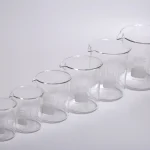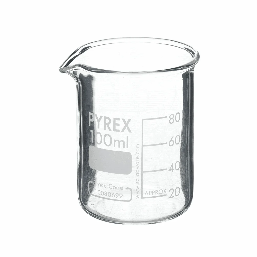 A beaker is generally a cylindrical container with a flat bottom. Most also have a small spout to aid pouring, as shown in the picture. Beakers are available in a wide range of sizes, from one millilitre up to several litres.